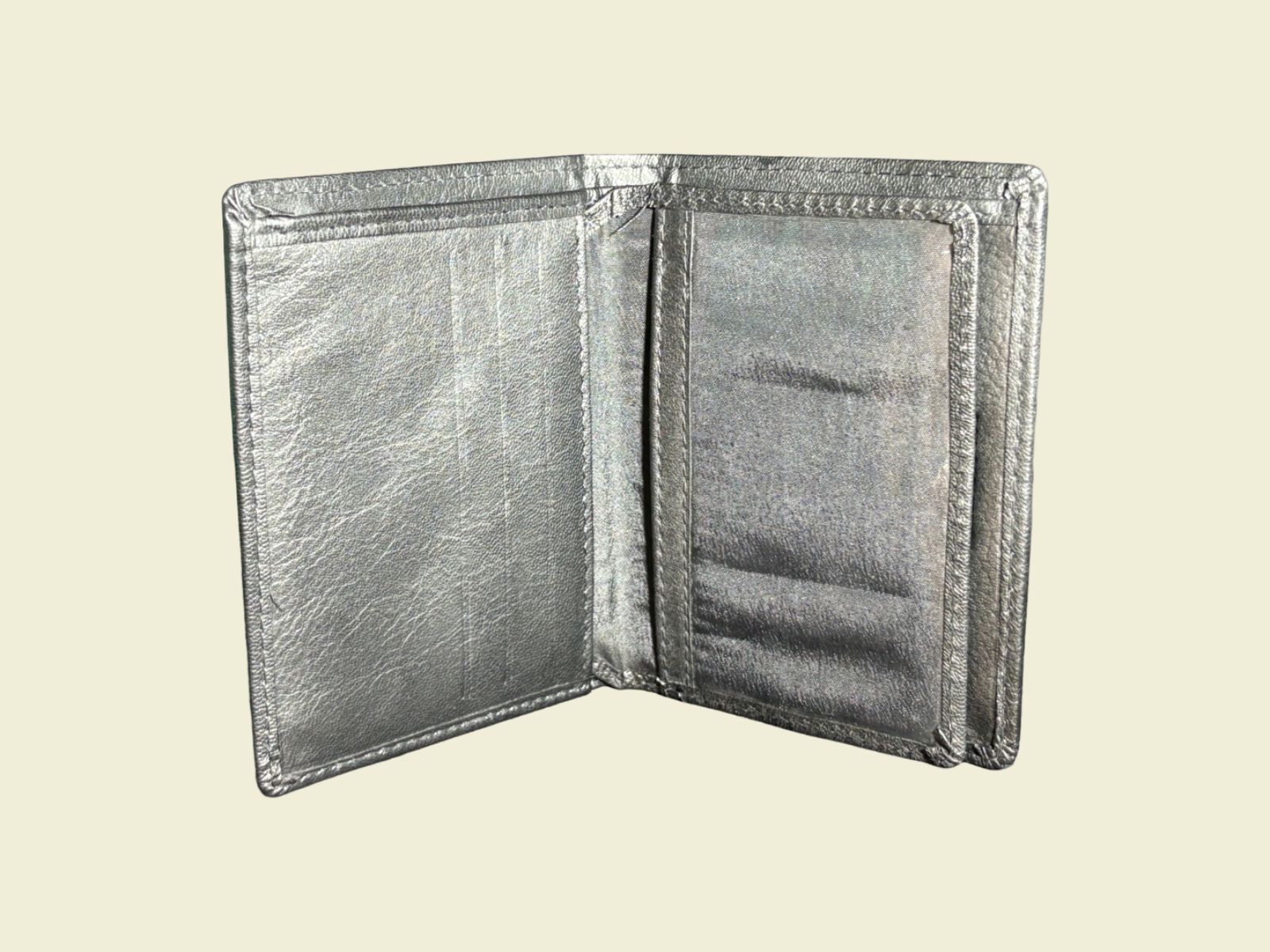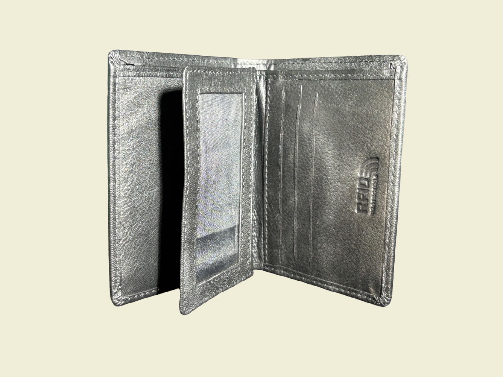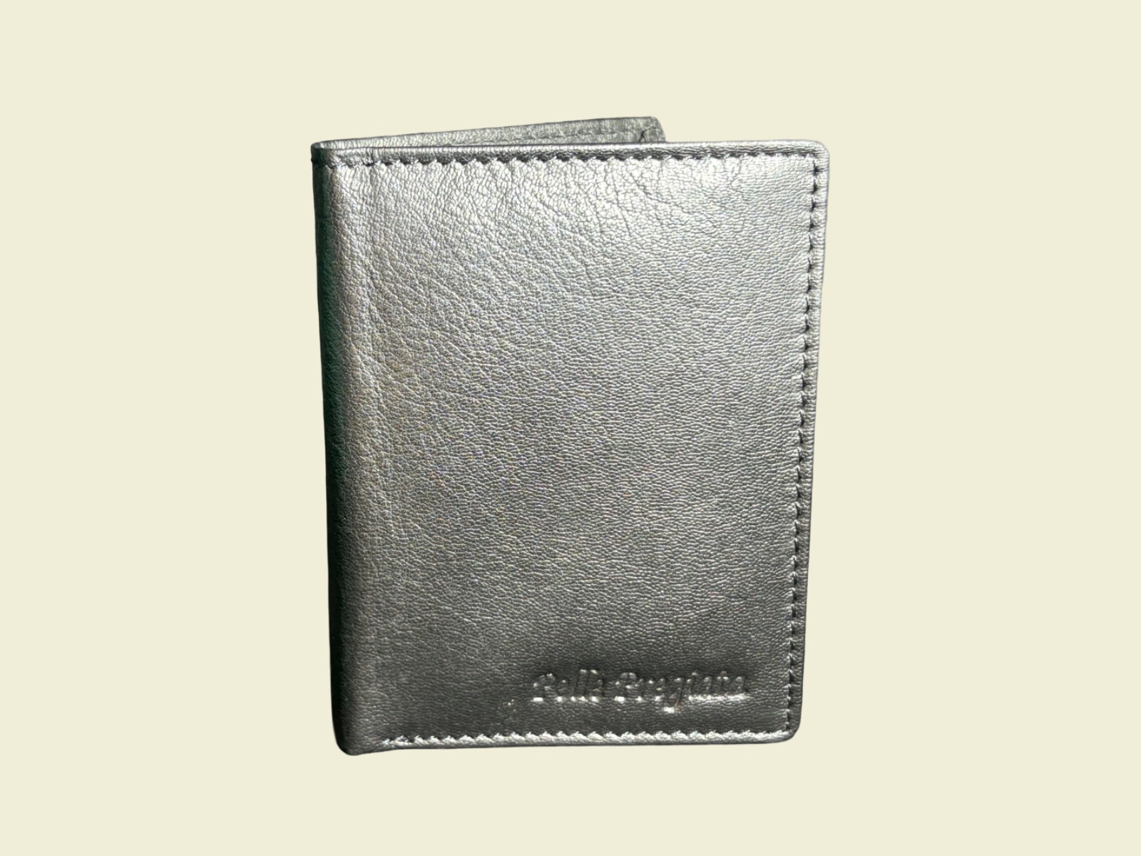 The wallet is finished in a contemporary metallic-grey tone that adds a bold, distinctive character while maintaining timeless appeal. Durable stitching and high-grade leather ensure long-lasting use, while the slim profile slides easily into pockets without adding bulk.