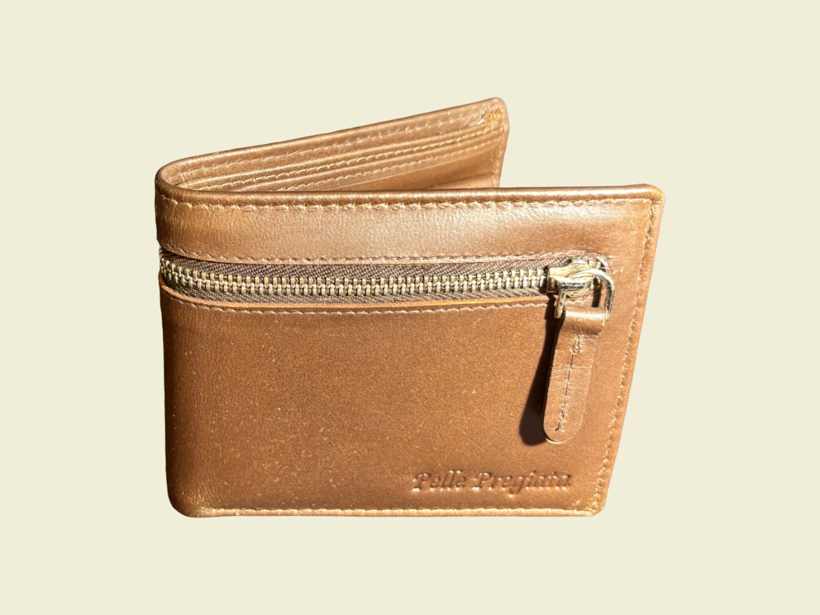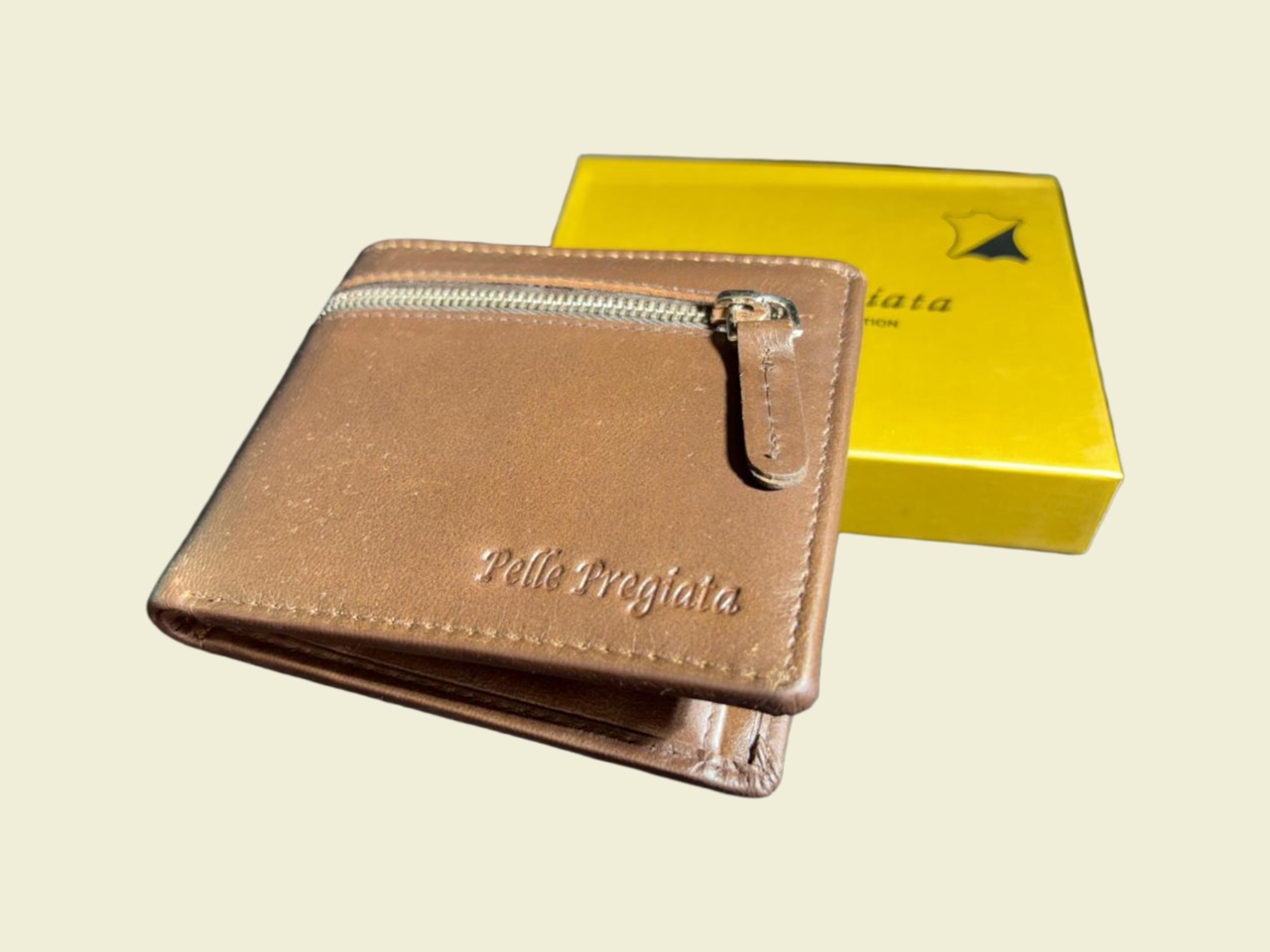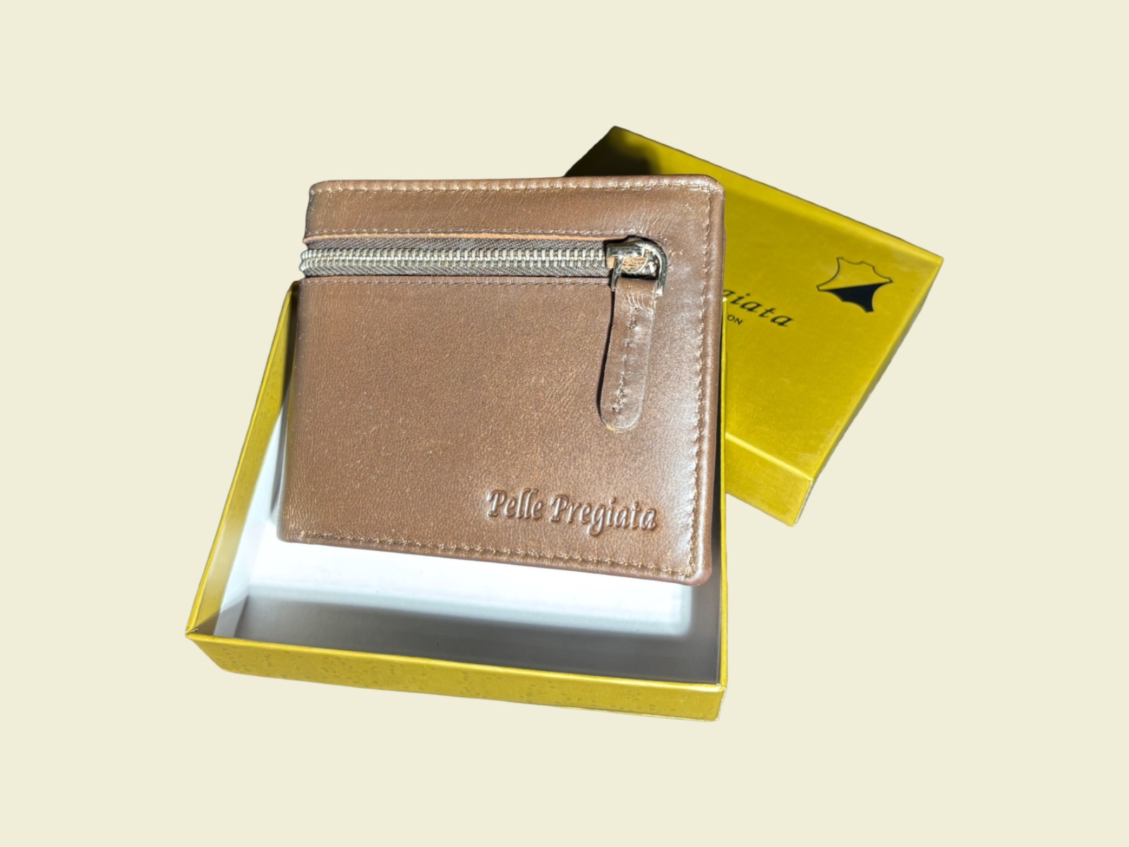 Its soft brown hue gives it a classic yet modern appeal, while the embossed Pelle Pregiata branding adds a subtle mark of distinction. Whether you’re heading out for daily errands or traveling light, this wallet’s compact form and smooth zip functionality make it a perfect go-to choice.